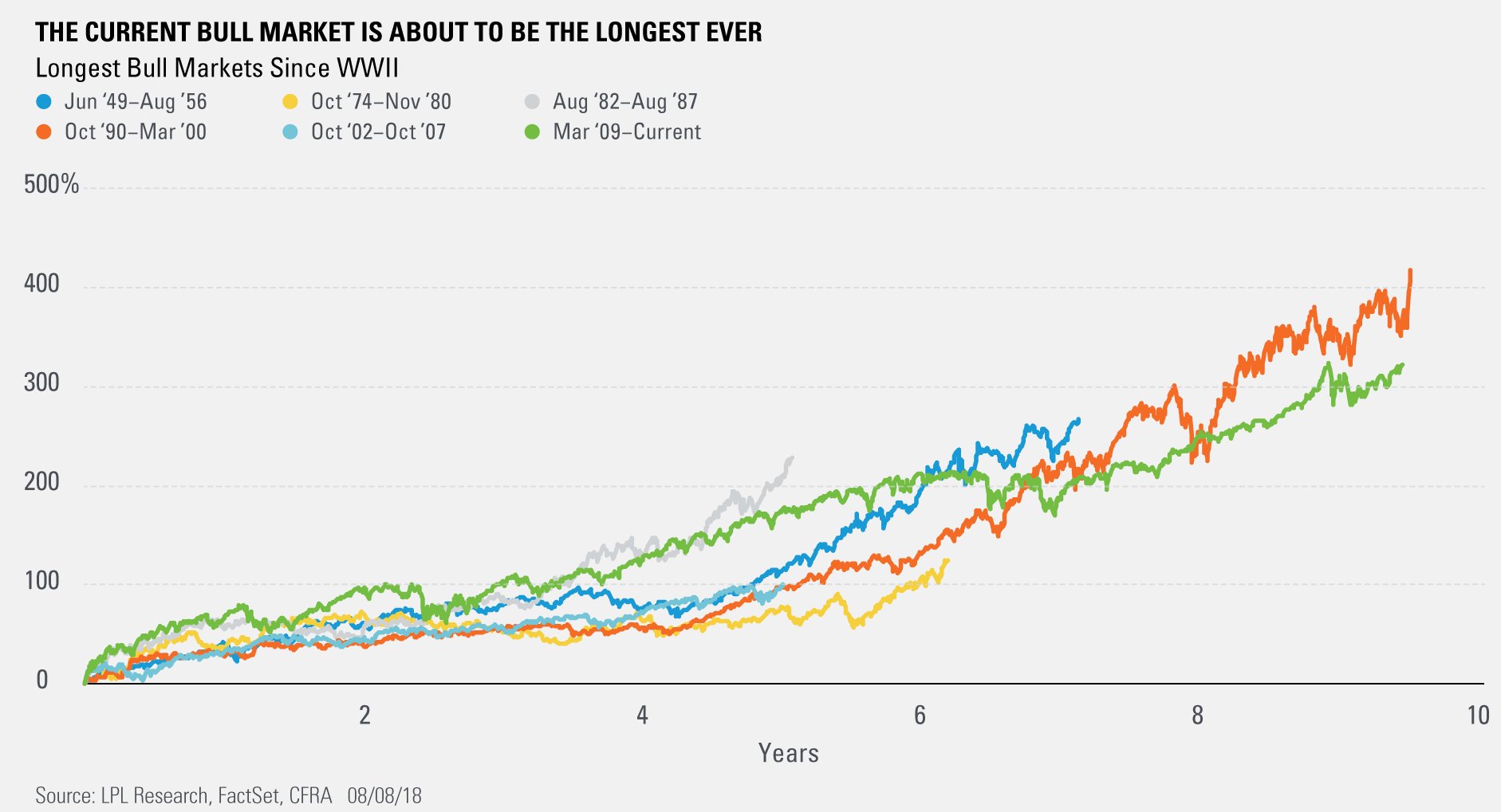 Don’t look now, but on August 22, 2018, this current bull market will top the 1990s bull market as the longest ever. However, be aware that the 1990s bull market saw the S&P 500 Index gain 417%, while the current bull market is up approximately 320%—so you can’t call this the greatest bull market…yet.